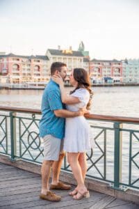 Romantic golden hour engagement photo at Disney’s Boardwalk Inn with a view of the lake and charming pastel buildings, captured by a top Disney photographer.