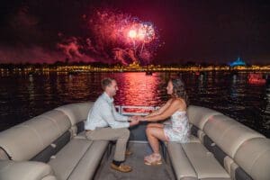 Disney fireworks proposal on a boat with professional low-light photography by Orlando-based proposal expert.