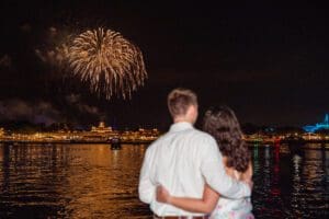 Disney fireworks surprise proposal on a private boat with low-light photography by expert Orlando photographer.